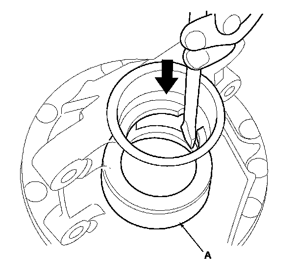 12. Remove the bearing outer race (A) from the differential carrier.