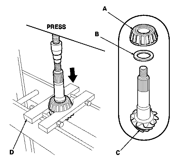 13. Remove the tapered roller bearing (A) and the thrust washer (B) from the drive pinion (C) using a commercially available bearing separator (D) and a press as shown.