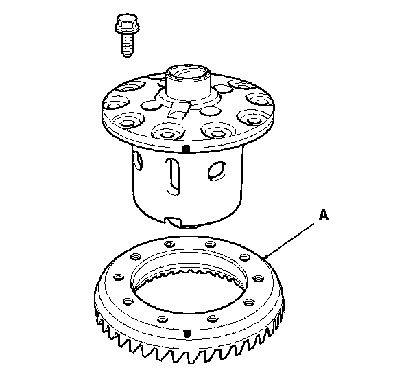 16. Remove the ten mounting bolts in a crisscross pattern in several steps, then remove ring gear (A).