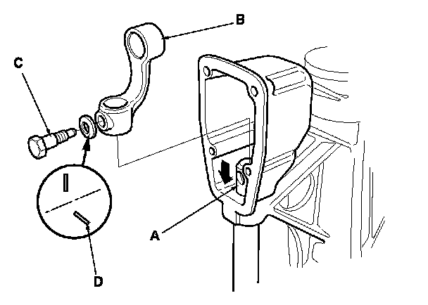 2. Lower the shift rod (A), then remove the 8 mm special bolt (C), the conical spring washer (D), and shift arm B.