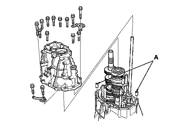 11. Remove the transmission housing and the 14 x 20 mm dowel pins (A).