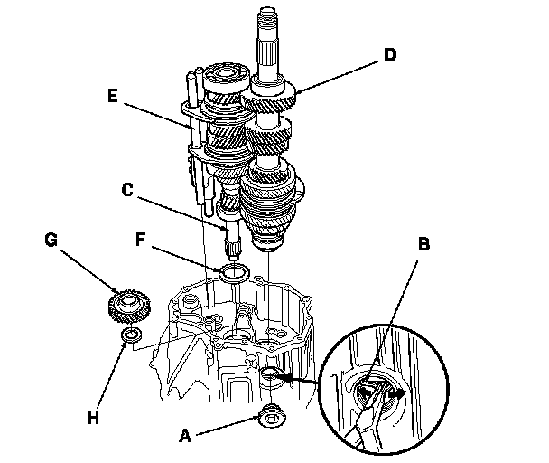 24. Remove the mainshaft (C), the countershaft (D), and the shift forks assembly (E), and remove the 64 mm spring washer (F), the reverse idler gear (G), and thrust washer (H).