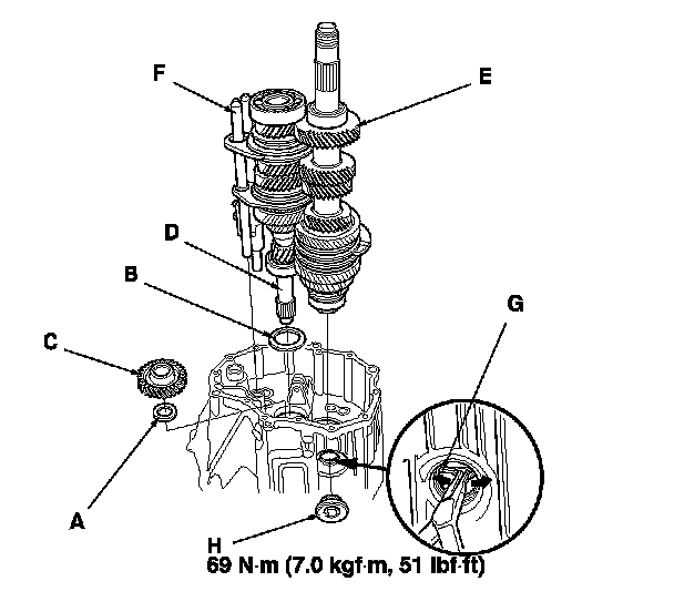 4. Install reverse idler gear (C), the mainshaft (D), the countershaft (E), and the shift forks assembly (F) using snap ring pliers, and set the 68 mm snap ring (G) into the groove of the countershaft bearing.