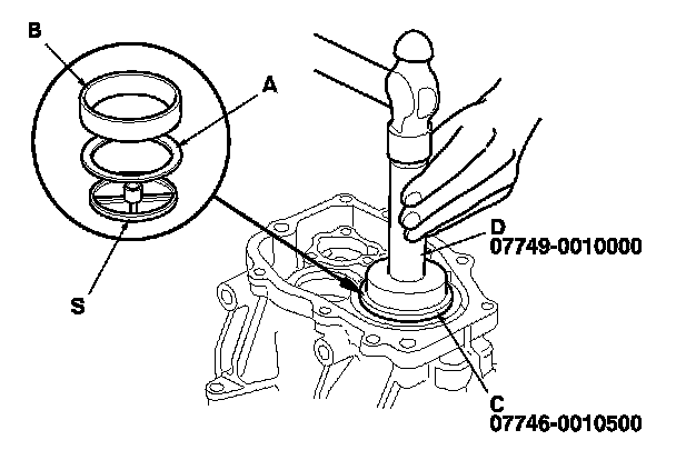 2. Install the shim (A) and the bearing outer race (B) into the rear cover using the 62 x 68 mm bearing driver attachment (C) and the 15 x 135L driver handle (D) as shown.