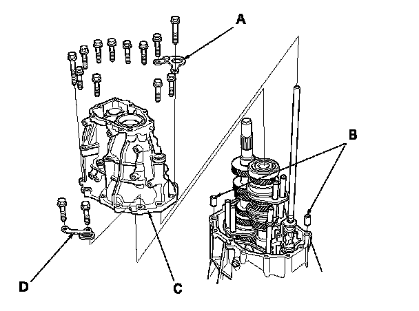 19. Install the 14 x 20 dowel pins (B), the transmission housing (C), the 8 mm flange bolts, the transmission hanger (D), and transmission hanger A.