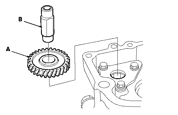 31. Install the oil pump gear (A) and oil pump gear shaft (B).