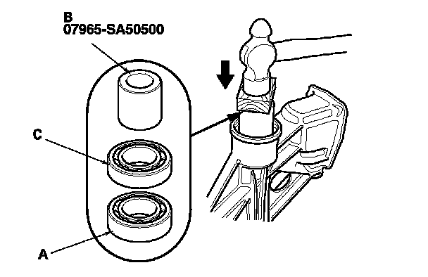 4. Install a new ball bearing (A) using the 35 mm I.D. attachment (B) and the old bearing (C).