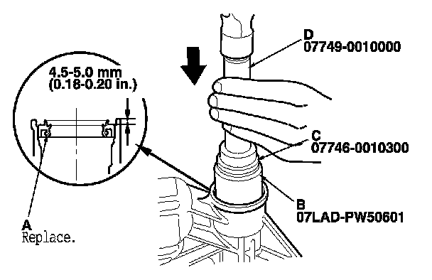 5. Install a new oil seal (A) using the 40 x 50 mm I.D. attachment (B), the 42 x 47 mm bearing driver attachment (C), and the 15 x 135L driver handle (D) as shown.