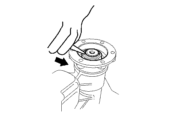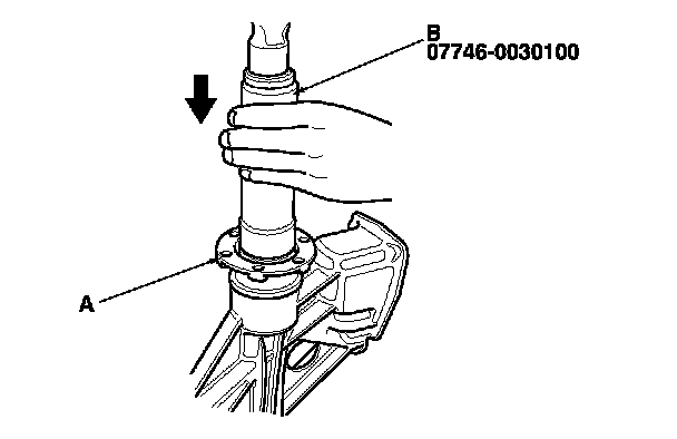 1. Install the bearing outer race (A) using the 72 x 75 mm bearing driver attachment (B) and the 15 x 135L driver handle (C) as shown.