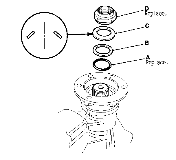 7. Install a new O-ring (A), the back-up ring (B), the spring washer (C), and a new 27 mm locknut (D) as shown.