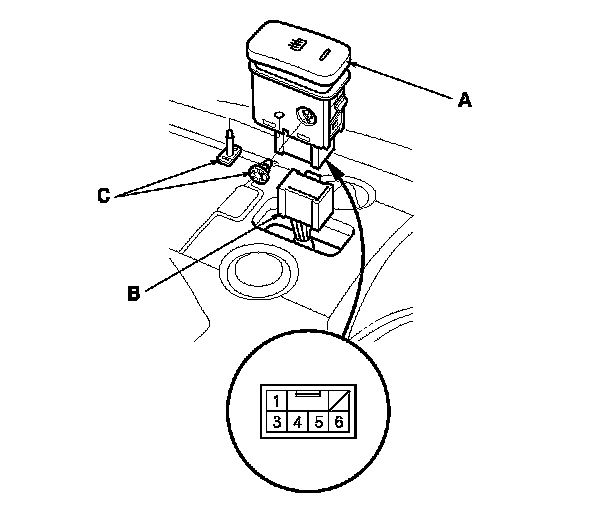 2. Remove the rear window defogger switch (A) from the center console, then disconnect the 6P connector (B).