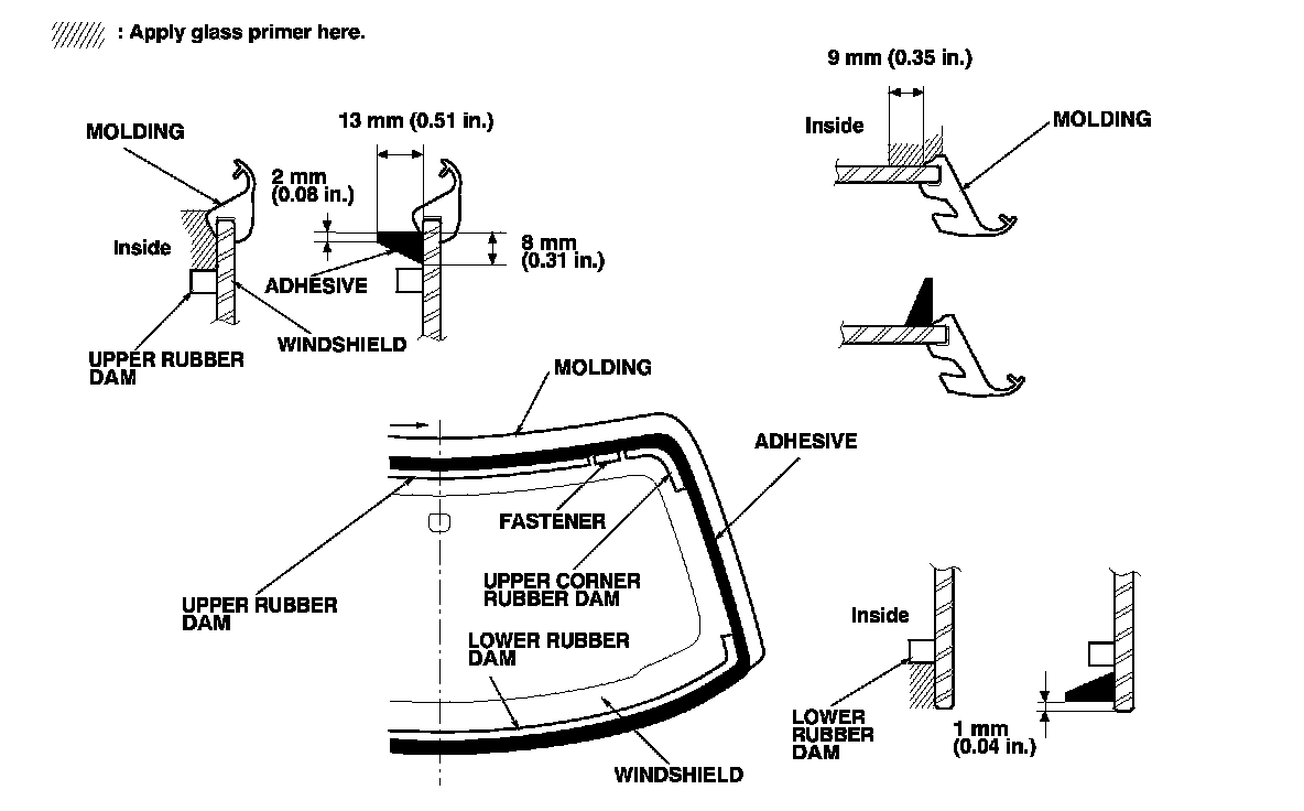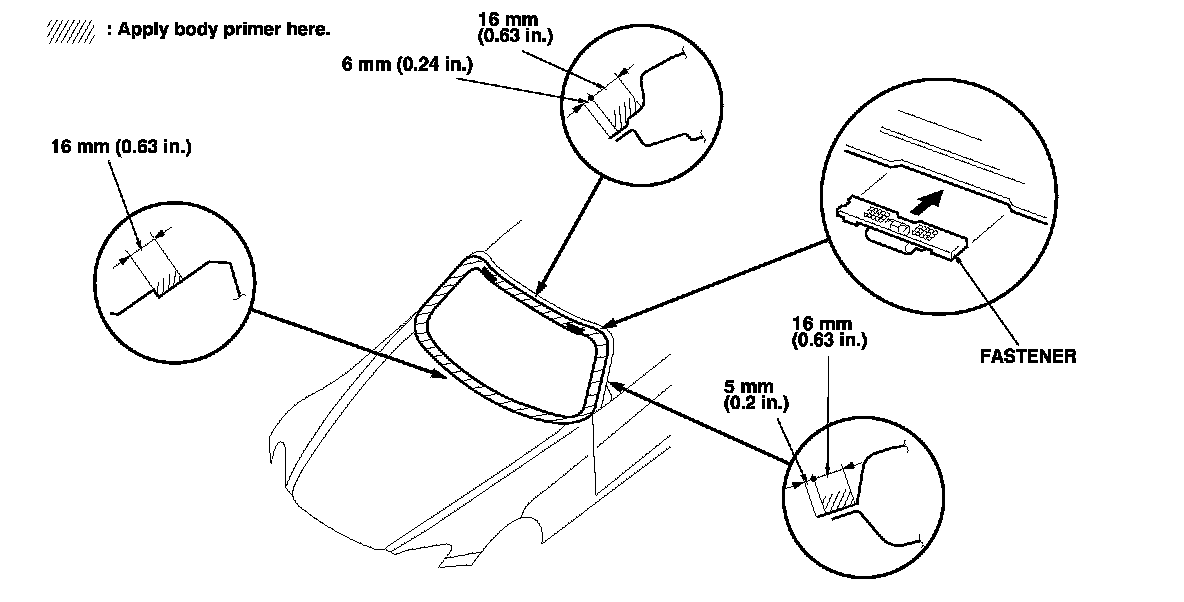 - To attach the molding, apply primer to the areas between the alignment marks of the windshield.