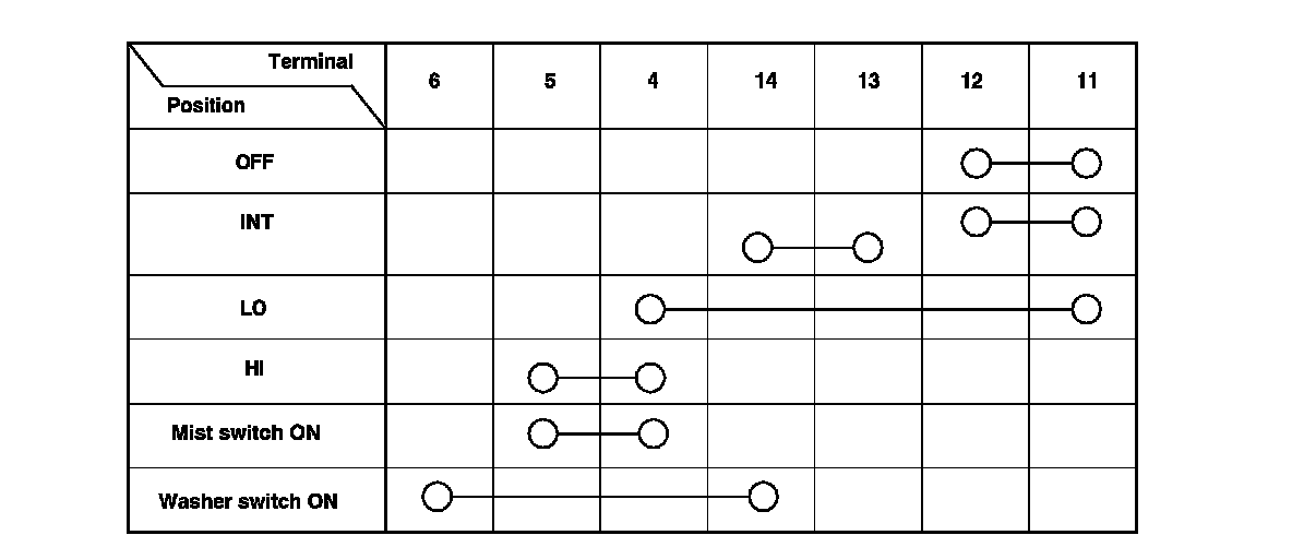 4. Check for continuity between the terminals in each switch position according to the table. If the continuity is not as specified, replace the switch.
