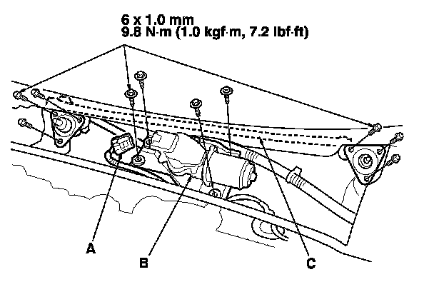 4. Remove the bolts, then remove windshield wiper linkage assembly (C).