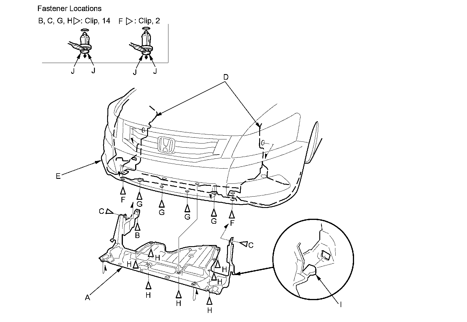 5. From under the body, detach the clips (H) that secure the front splash shield to the front subframe.