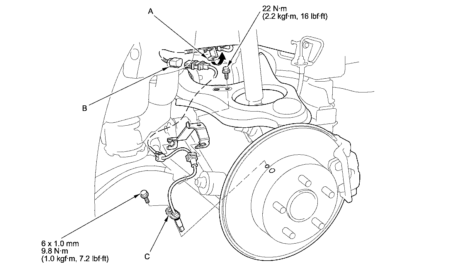 3. Remove the clamps, the bolt, and the wheel speed sensor (C).