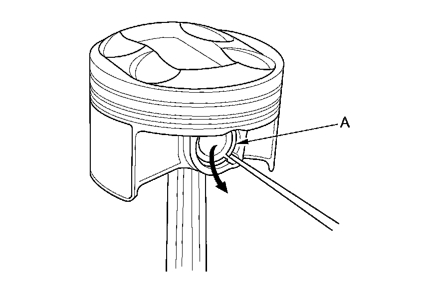 3. Remove the snap rings (A) from both sides of each piston. Start at the cutout in the piston pin bore. Remove the snap rings carefully so they do not go flying or get lost. Wear eye protection.