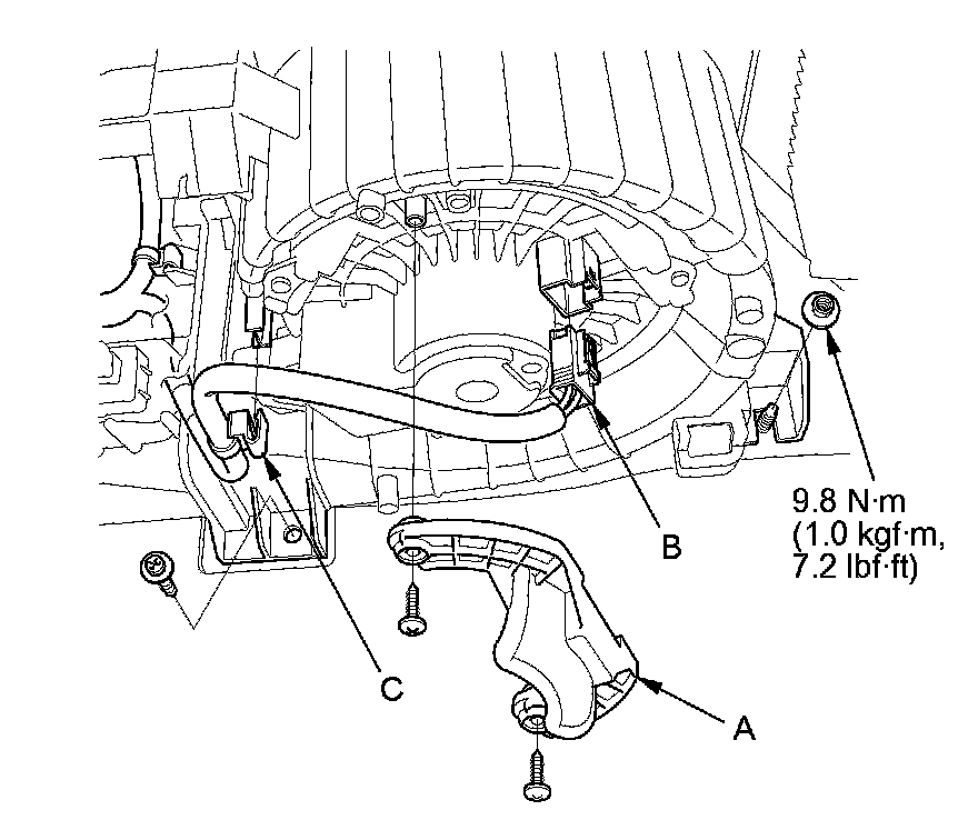 8. Disconnect the connector (B) from the blower motor and the wire harness clip (C). Remove the self-tapping screw and the mounting nut.
