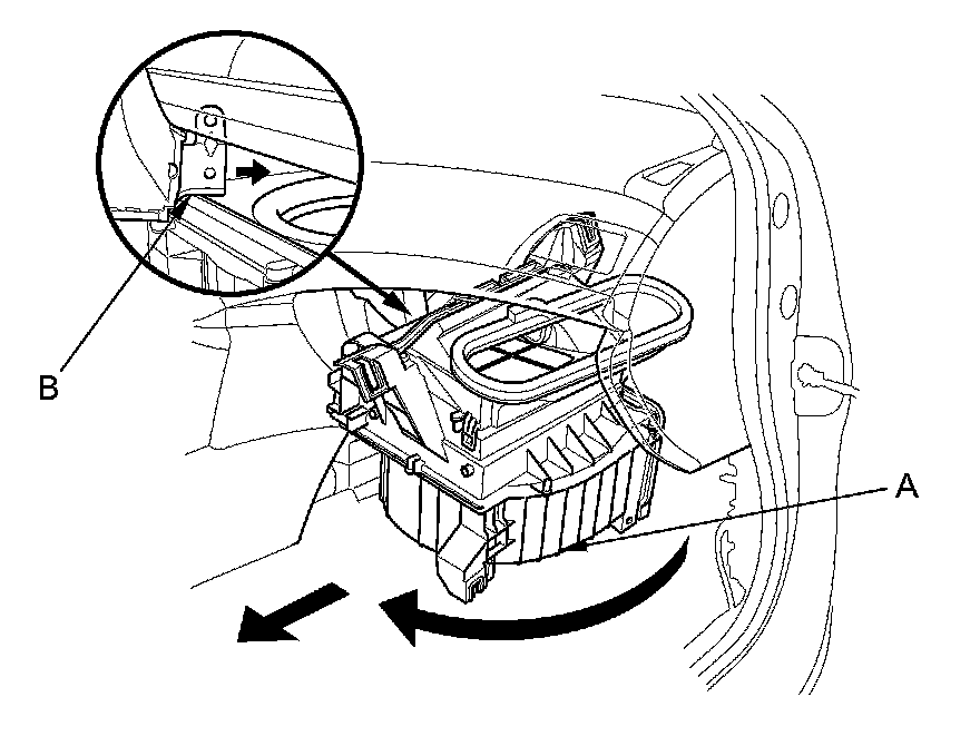 11. Pull the blower unit (A) out while rotating it clockwise as shown, so that the glove box bracket (B) passes through the dust and pollen filter area.
