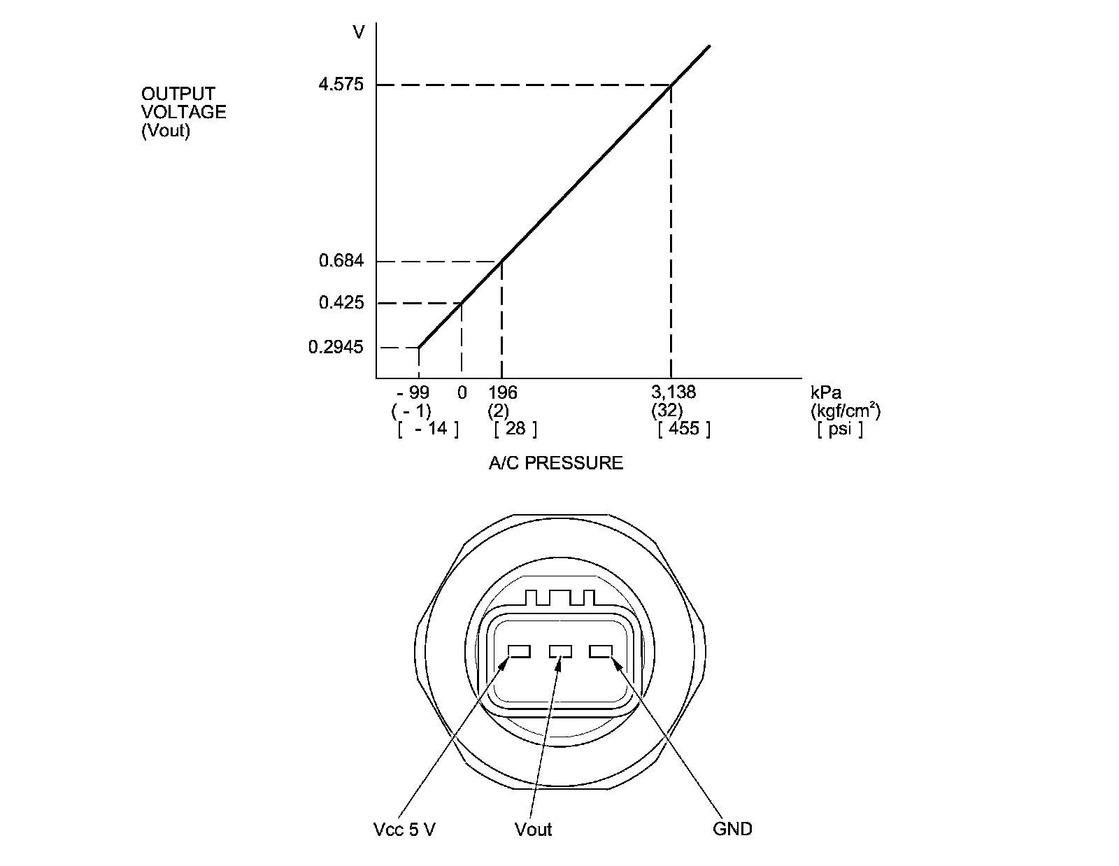 NOTE: When the refrigerant is below 196 kPa (2.0 kgf/cm2, 28 psi) or above 3,138 kPa (32 kgf/cm2, 455 psi), the ECM/PCM turns the A/C compressor clutch relay off to protect the A/C compressor. When the refrigerant pressure is above 1,470 kPa (15.0 kgf/cm2, 213 psi), the ECM/PCM switches the radiator and A/C condenser fans to high speed.