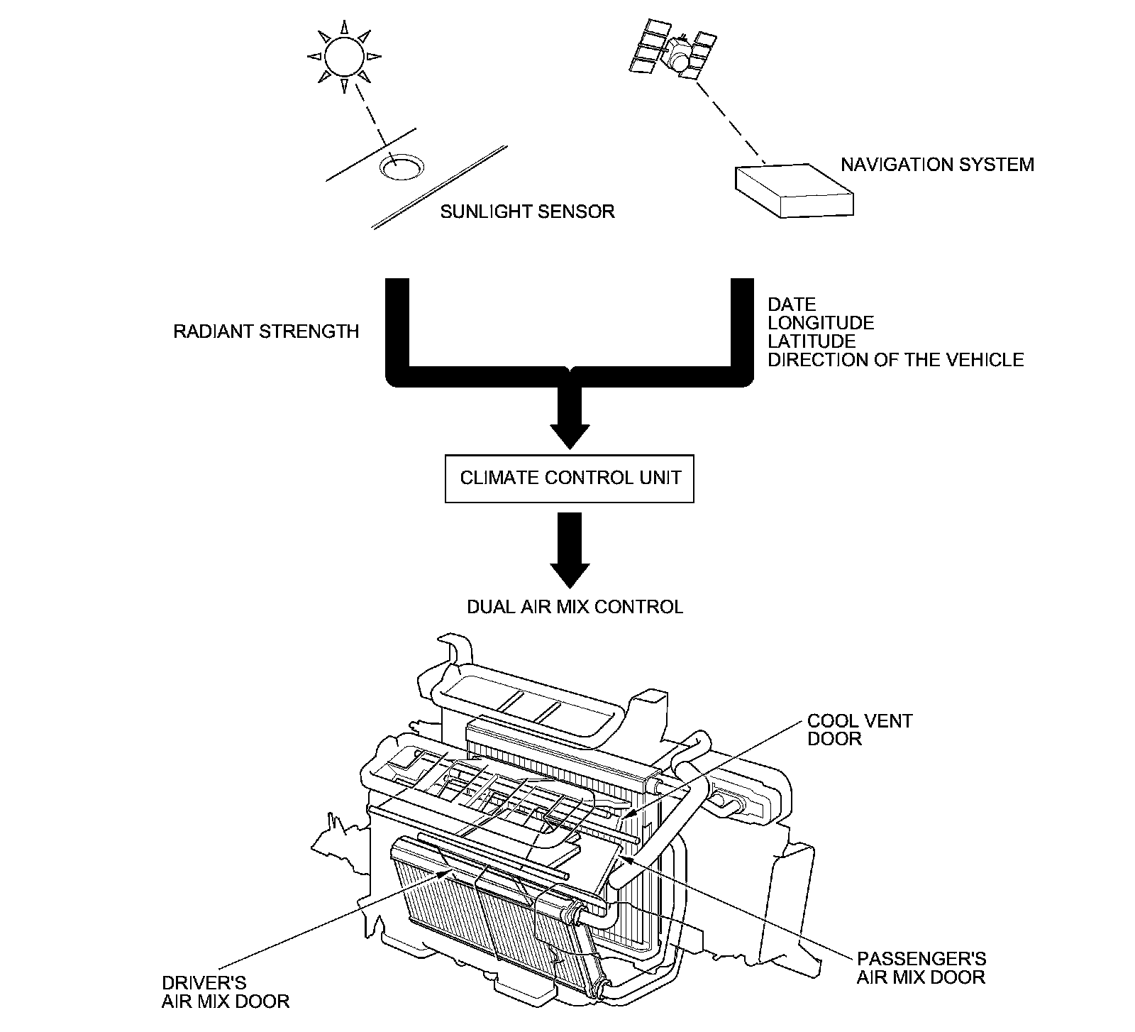 This system automatically controls the temperature and the vent mode of the air direction to the driver and passenger's side depending on the angle of the sun and the direction of the vehicle. It calculates information such as date, time, longitude, and latitude from the navigation system, as well as the radiant strength of the sun from the sunlight sensor, to determine the appropriate mode position and temperature to be directed to each side.