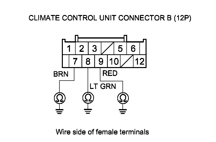 7. Check for continuity between body ground and climate control unit connector B (12P) terminals No. 7, No. 8, and No. 9 individually.