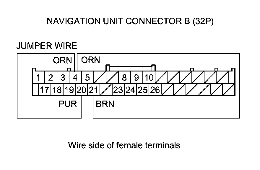 9. Connect navigation unit connector B (32P) terminals No. 4, No. 20, and No. 21 with jumper wires.