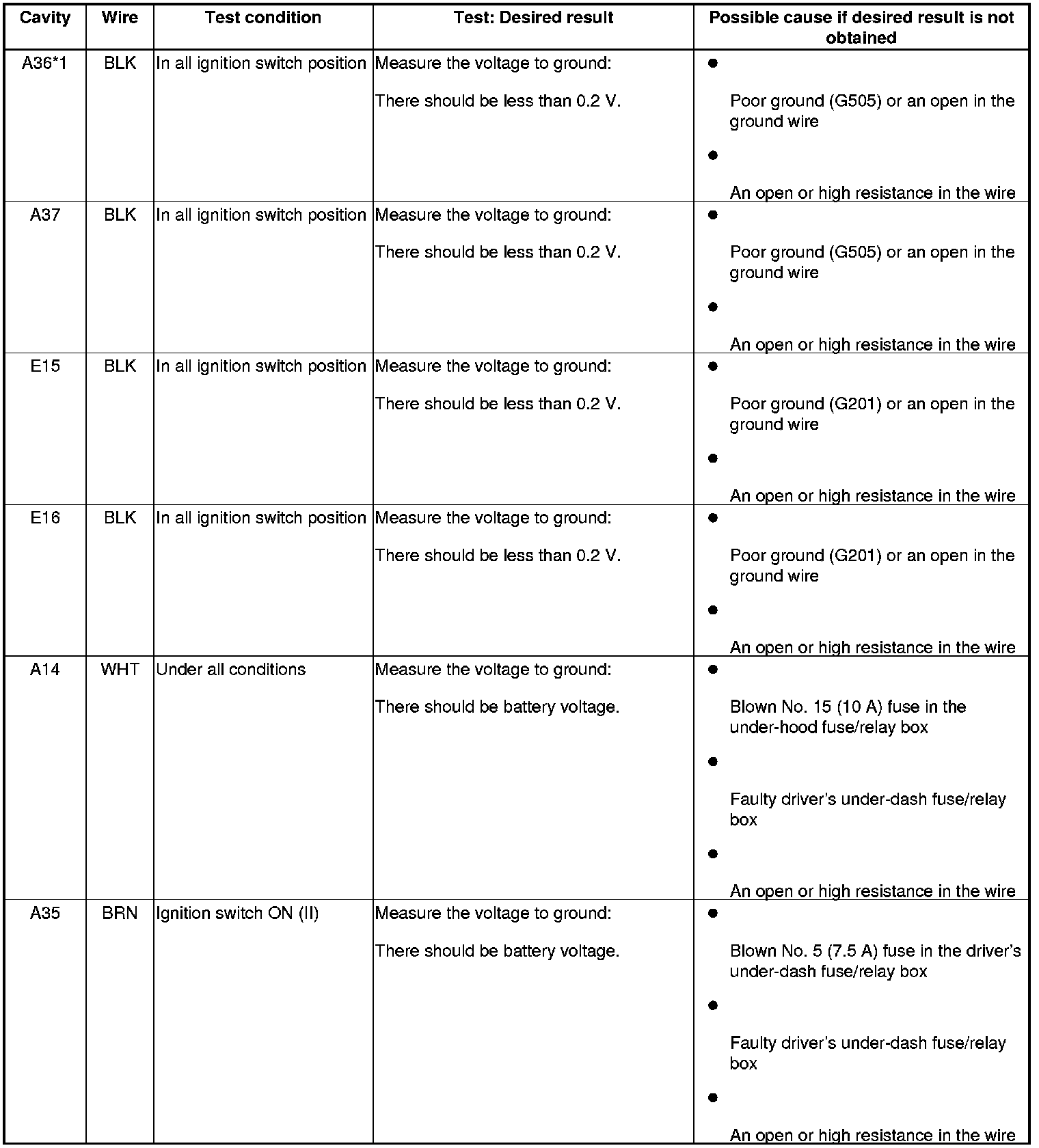 8. Reconnect the connectors to the passenger's under-dash fuse/relay box, and do these input tests at the following connectors.