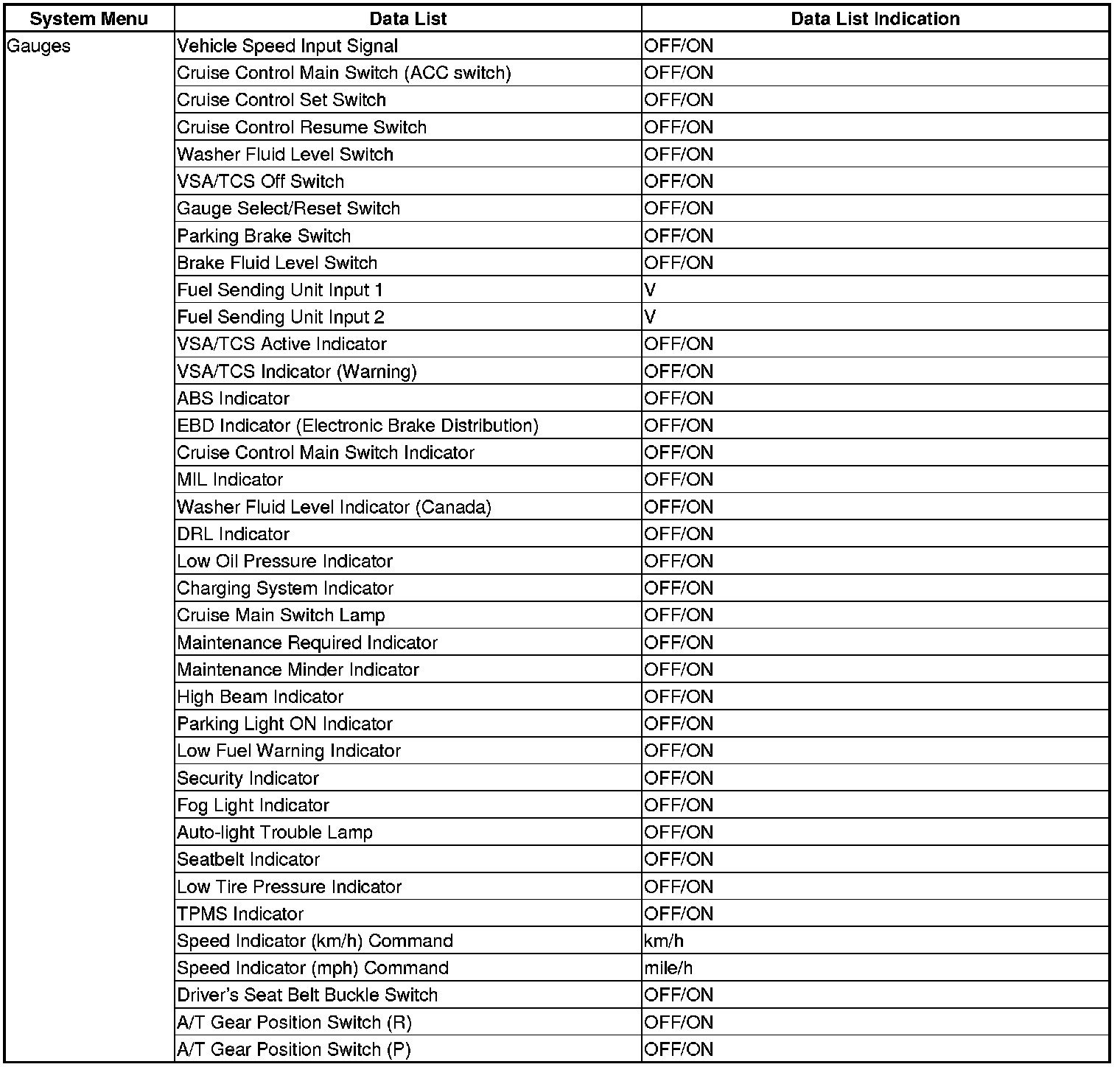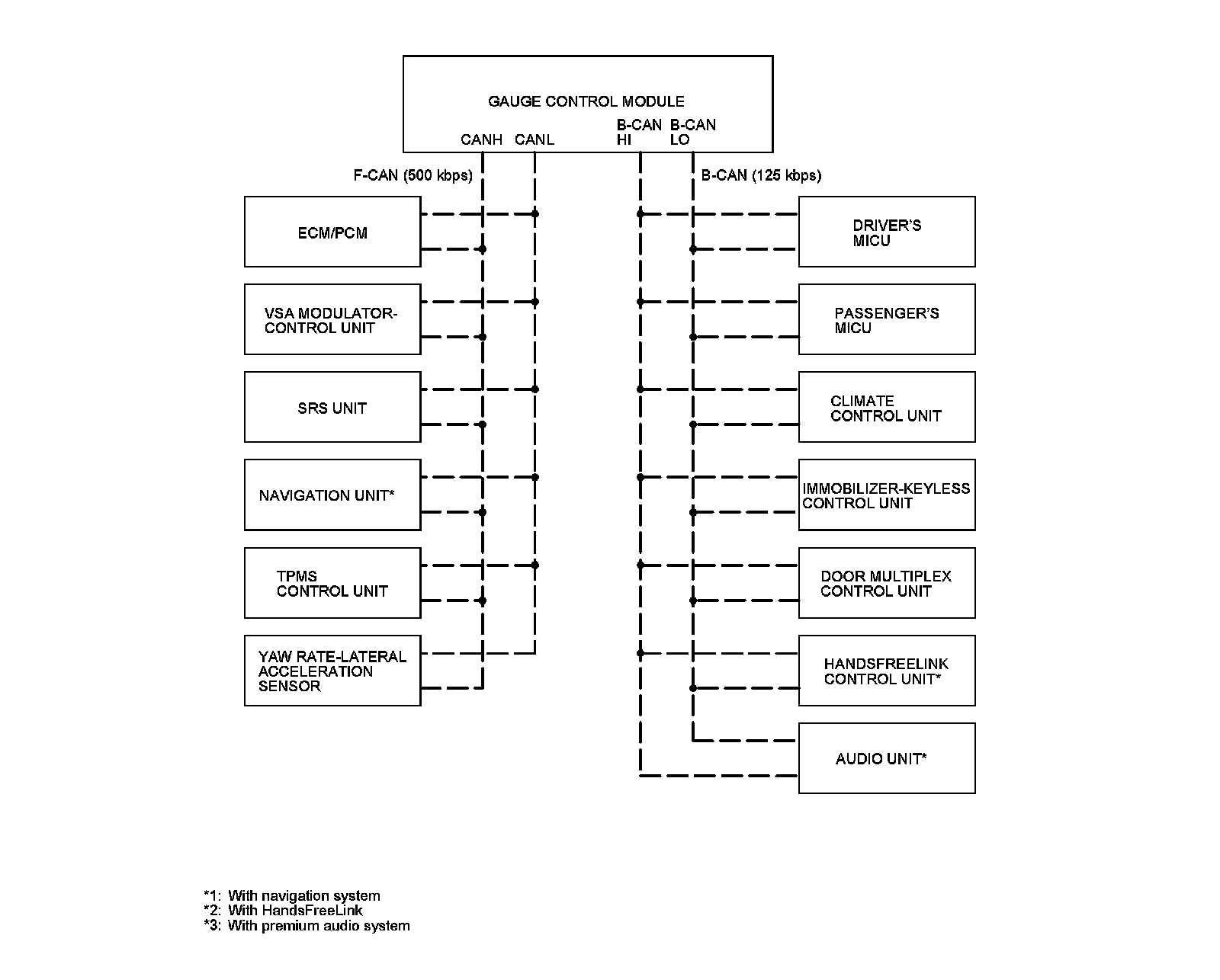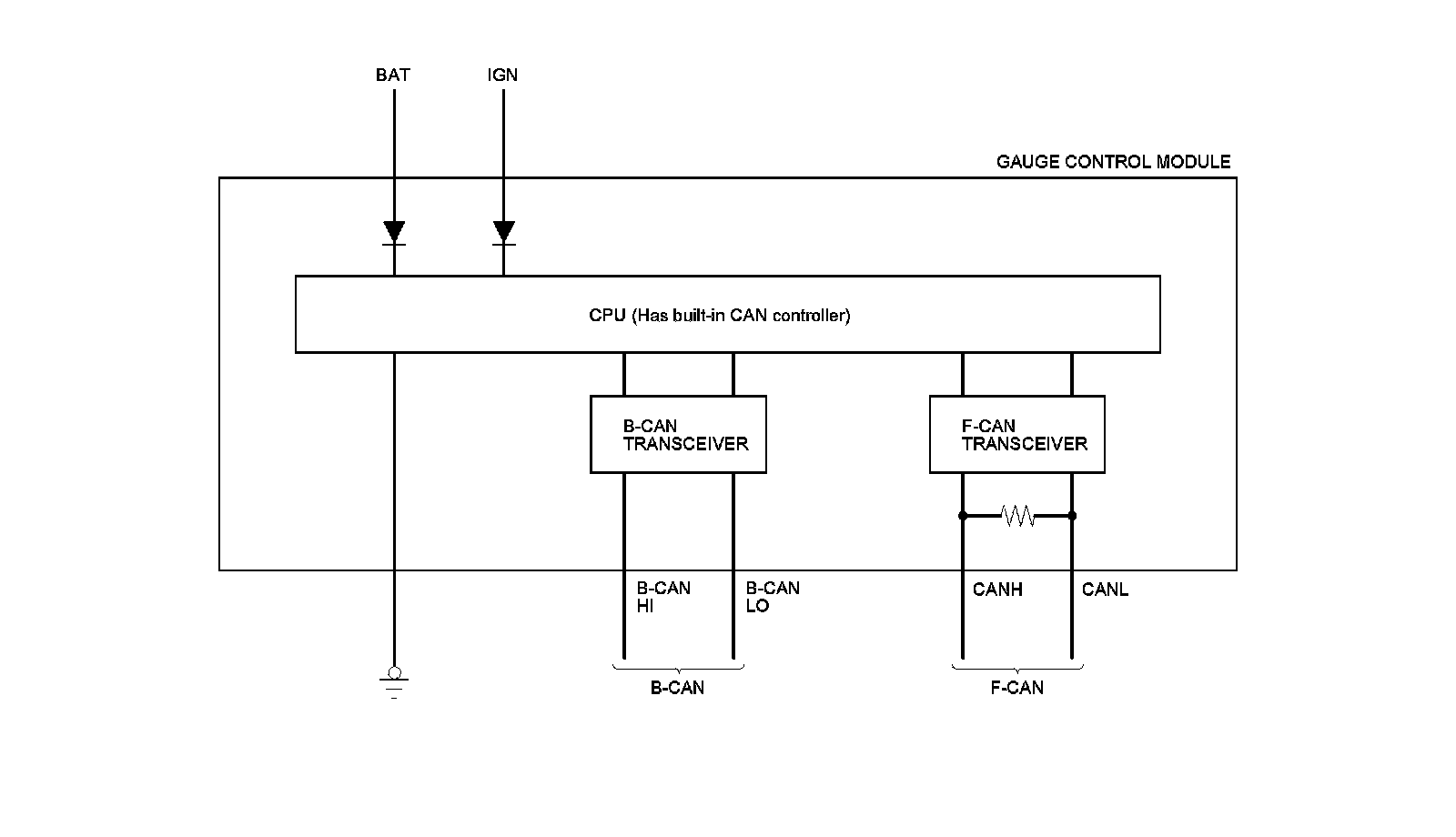 The body controller area network (B-CAN) and the fast controller area network (F-CAN) share information between multiple electronic control units (ECUs). B-CAN communication moves at a slower speed (125 kbps) for convenience related items and for other functions. F-CAN information moves at a faster speed (500 kbps) for "real time" functions such as fuel and emissions data. To allow both systems to share information, the gauge control module translates and relays the information from B-CAN to F-CAN and from F-CAN to B-CAN. This is called the Gateway Function.