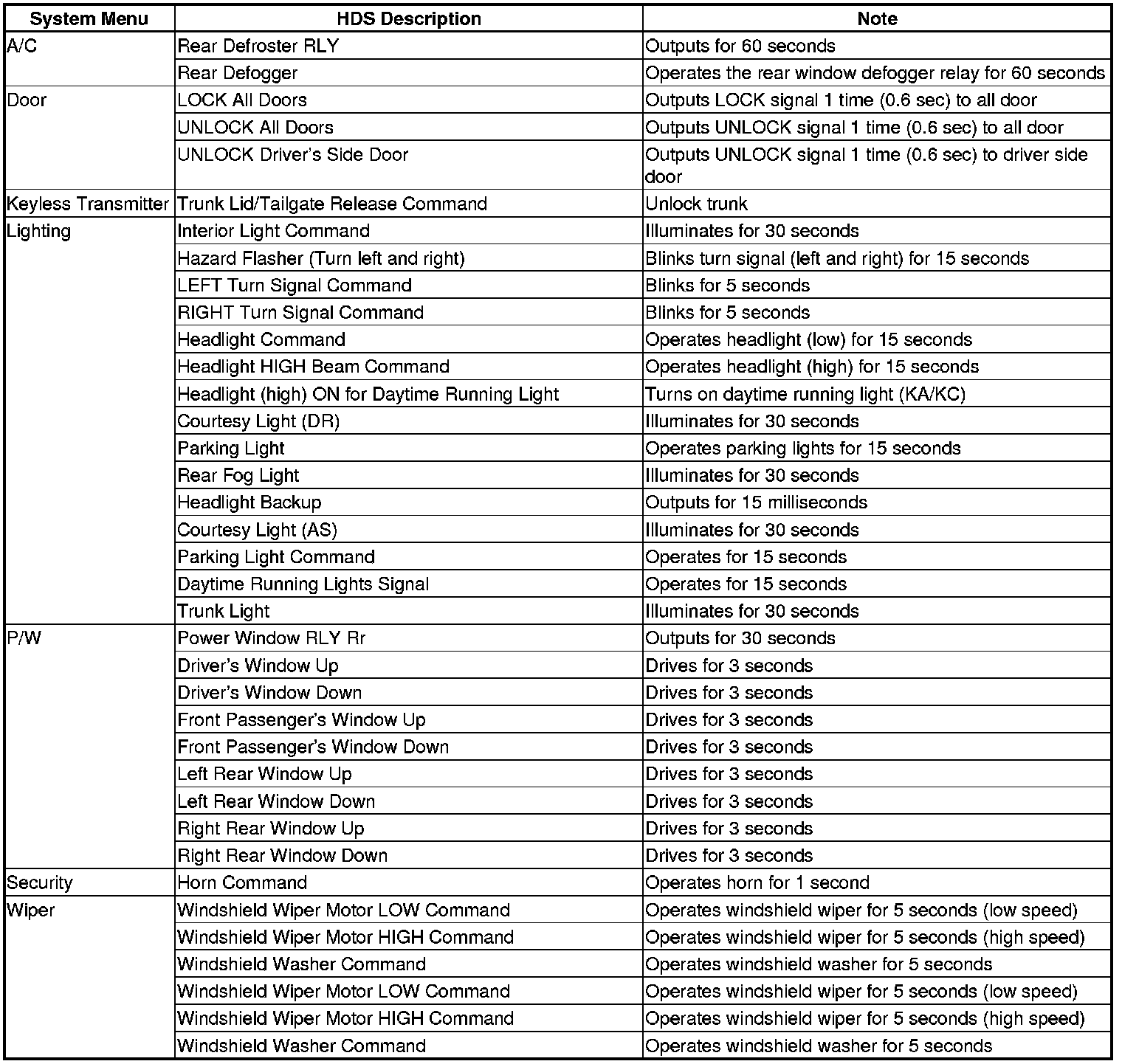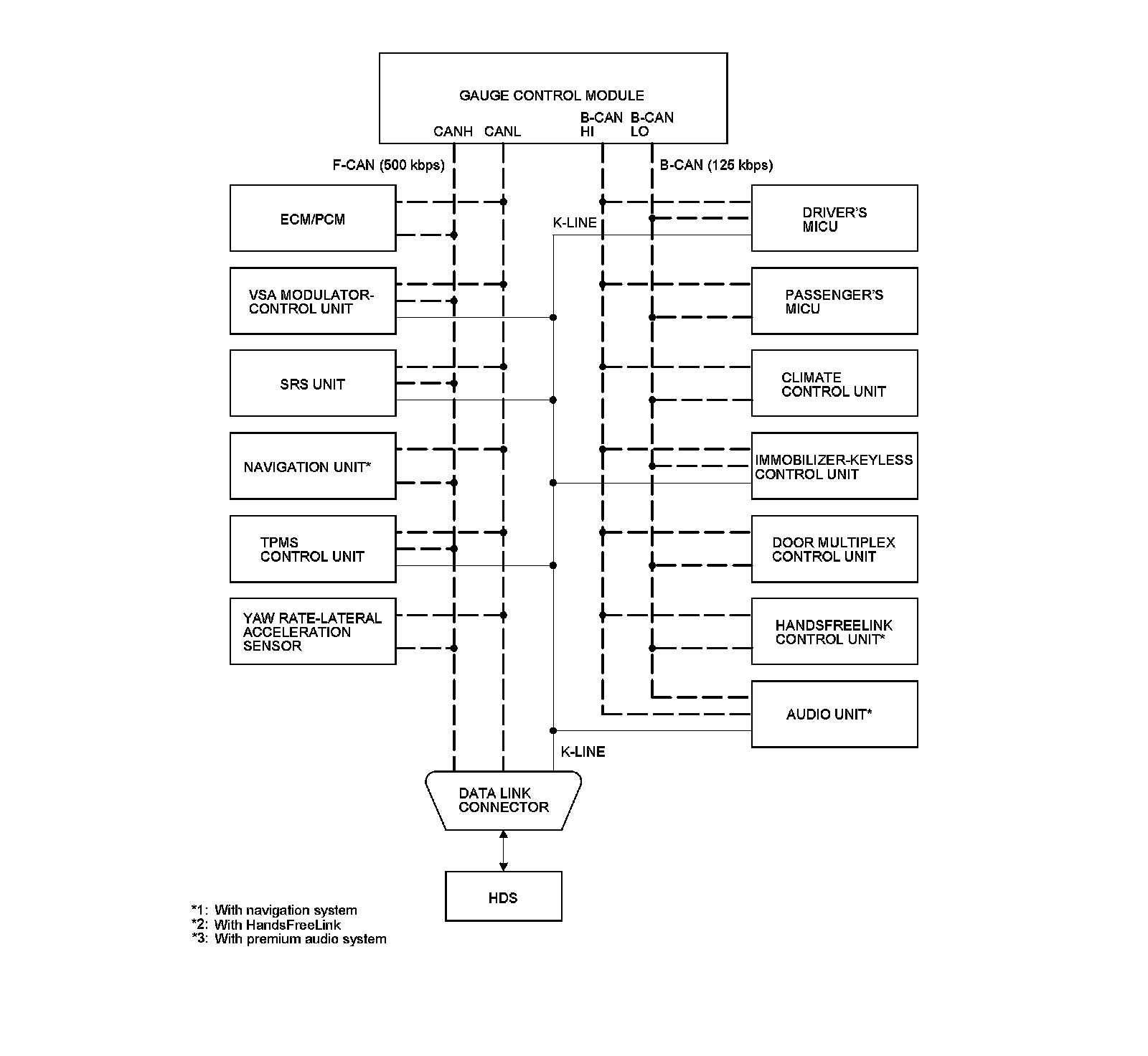 By connecting the HDS to the data link connector (DLC), the HDS can retrieve the diagnostic information from the driver's MICU via a diagnostic line called the K-LINE. The K-LINE is a separate communication line from the CAN lines, and is connected to most of the CAN related ECUs. The driver's MICU is a gateway between the HDS and B-CAN related ECUs, and sends B-CAN diagnostic information to the HDS. When doing a function test with the HDS, the HDS sends an output signal through the K-LINE to the driver's MICU. The driver's MICU either relays the request to another ECU, or commands the function itself.