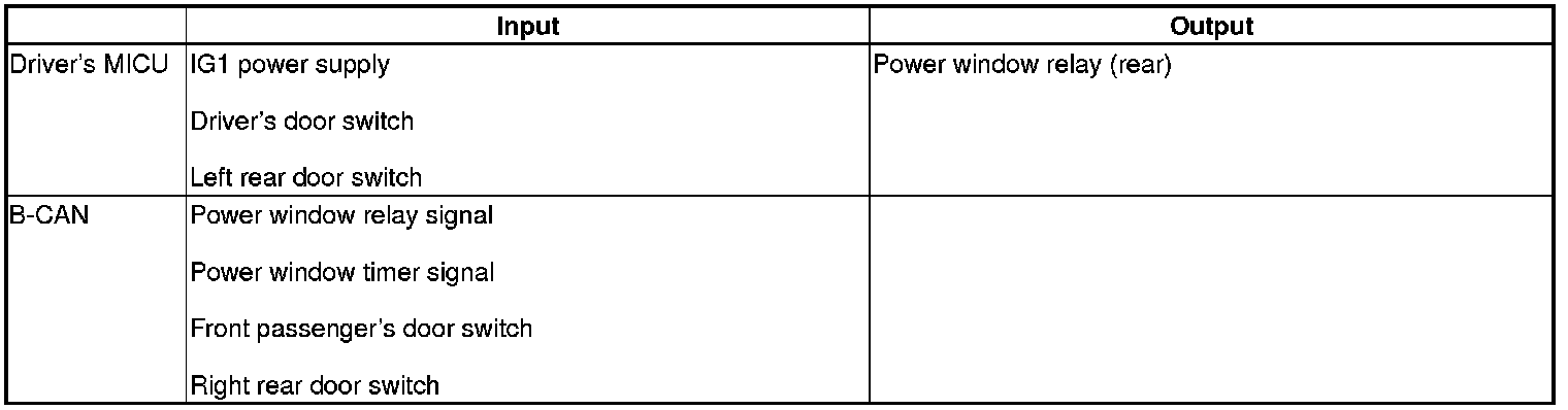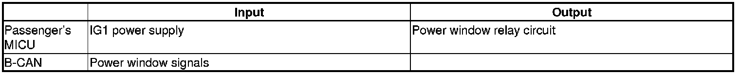 The passenger's MICU control of the power window relay circuit in the passenger's under-dash fuse/relay box is based on inputs from the power window switches.