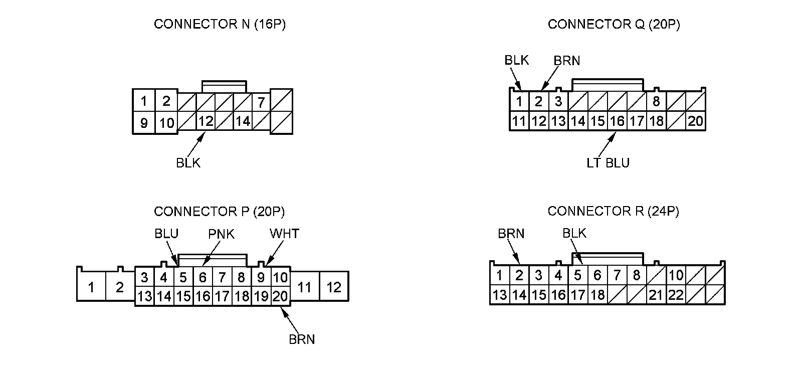 2. Disconnect driver's under-dash fuse/relay box connectors N, P, Q, and R.