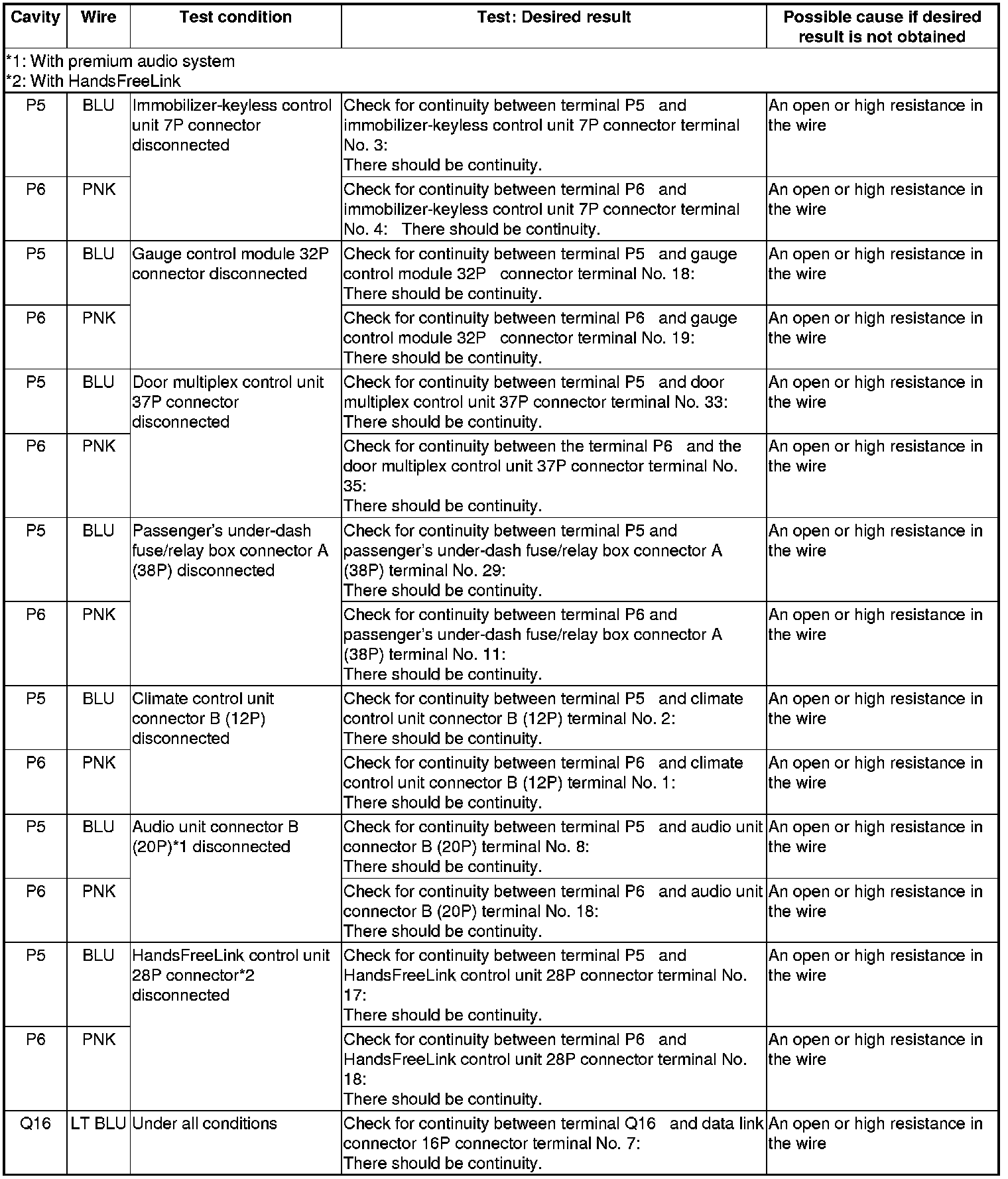 NOTE: Before testing, troubleshoot the multiplex integrated control unit first, using B-CAN System Diagnosis Test Mode A Troubleshooting - B-CAN System Diagnosis Test Mode A.