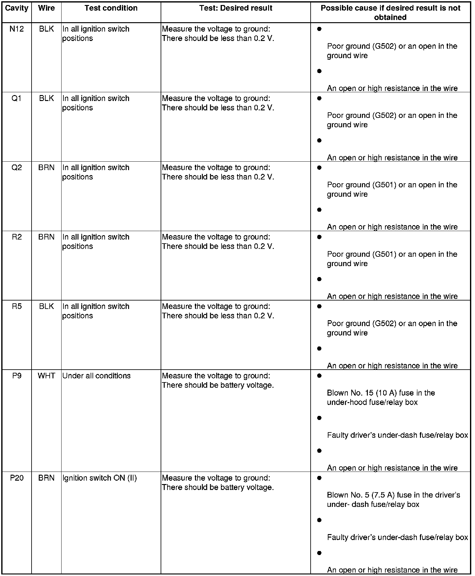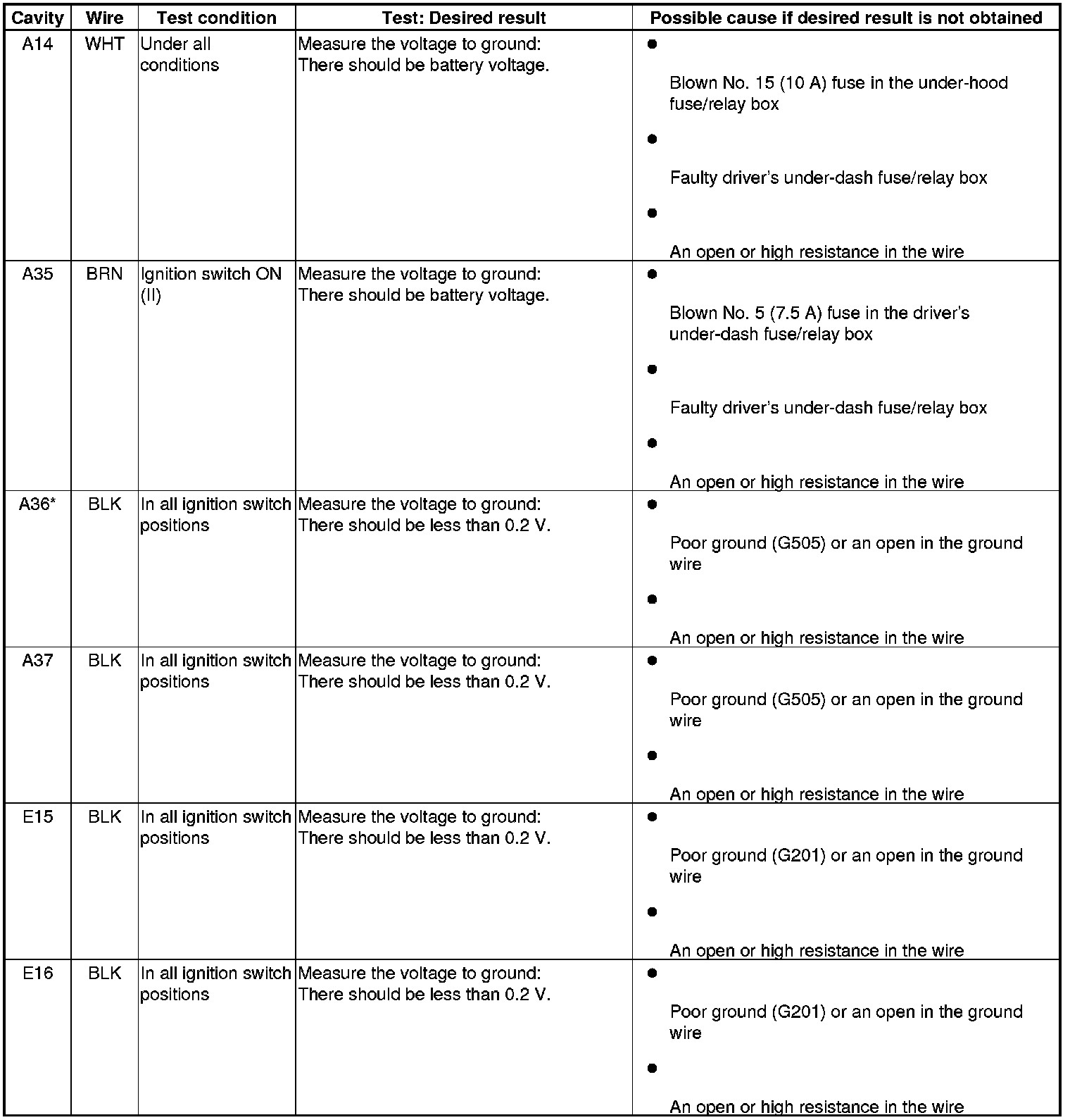 5. Reconnect the connectors to the driver's under-dash fuse/relay box, turn the ignition switch to ON (II), and do these input tests at the following connectors.