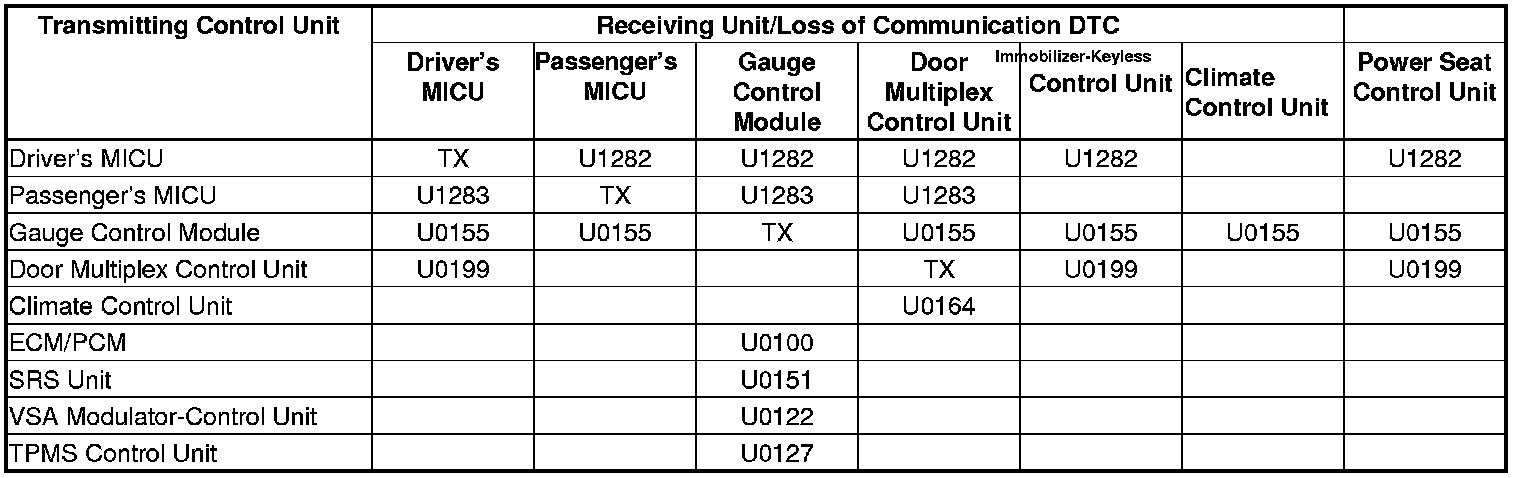 1. Find the Transmitting Control Unit that is in the same row as all of the loss of communication DTCs retrieved.