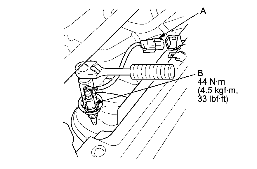 1. Disconnect the A/F sensor 4P connector (A), then remove the A/F sensor (B).