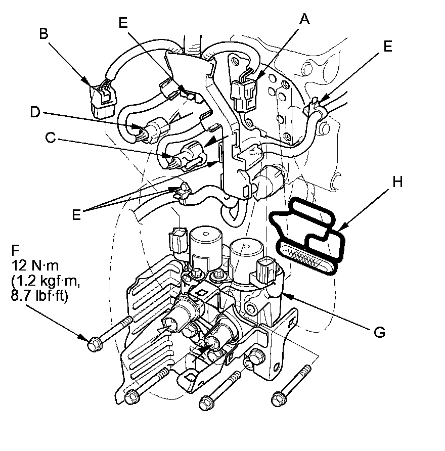 4. Remove the rocker arm oil control valve assembly (G) and the rocker arm oil control valve filter (H).