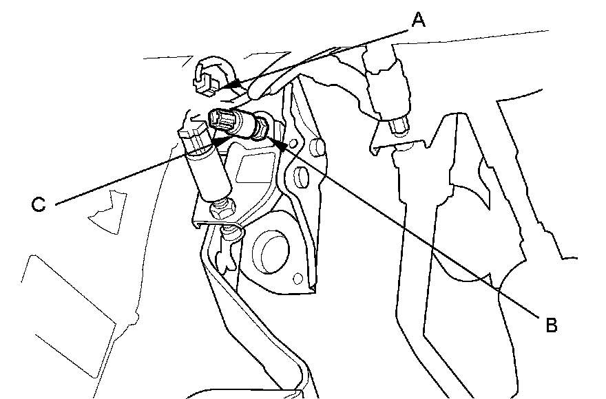 2. Loosen the locknut (B), then remove the clutch interlock switch (C).
