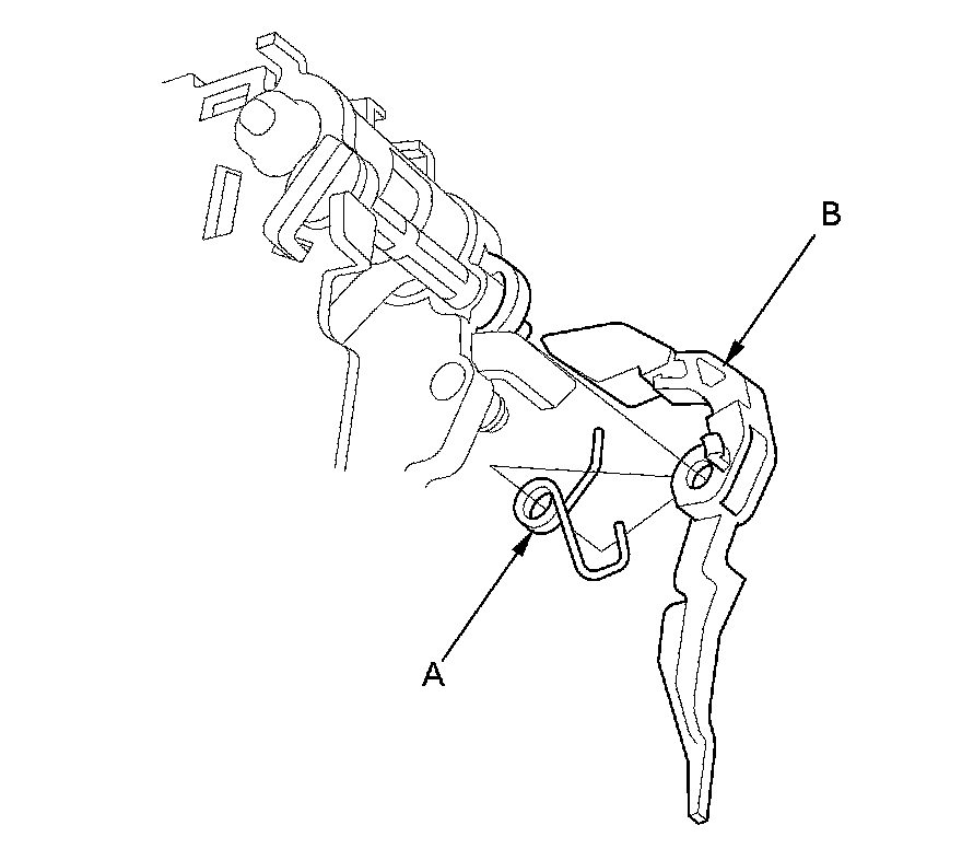 8. Release the lock (A) of the shift lock release, and remove the shift lock release and the release spring (B).