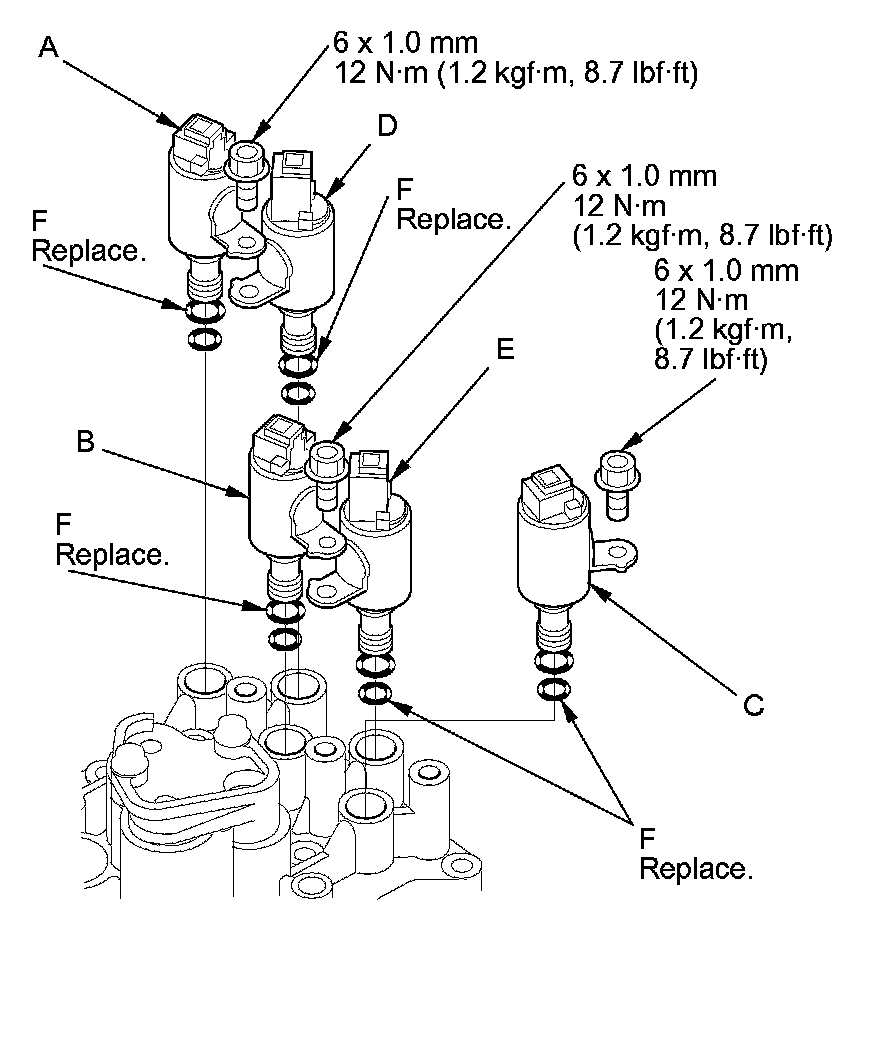2. Install new O-rings (two O-rings per shift solenoid valve) (F) on the shift solenoid valves.