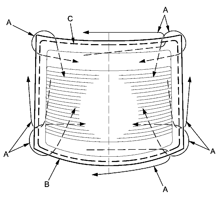 - Apply the glass primer to the corner areas of the rear window using the printed dots (C) on the rear window as a guide.