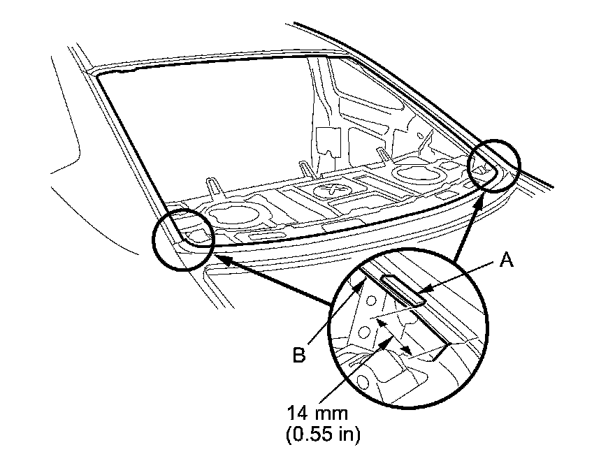 14. Attach the fasteners (A) with the adhesive tape to the rear window opening flange (B) of the body on both sides.
