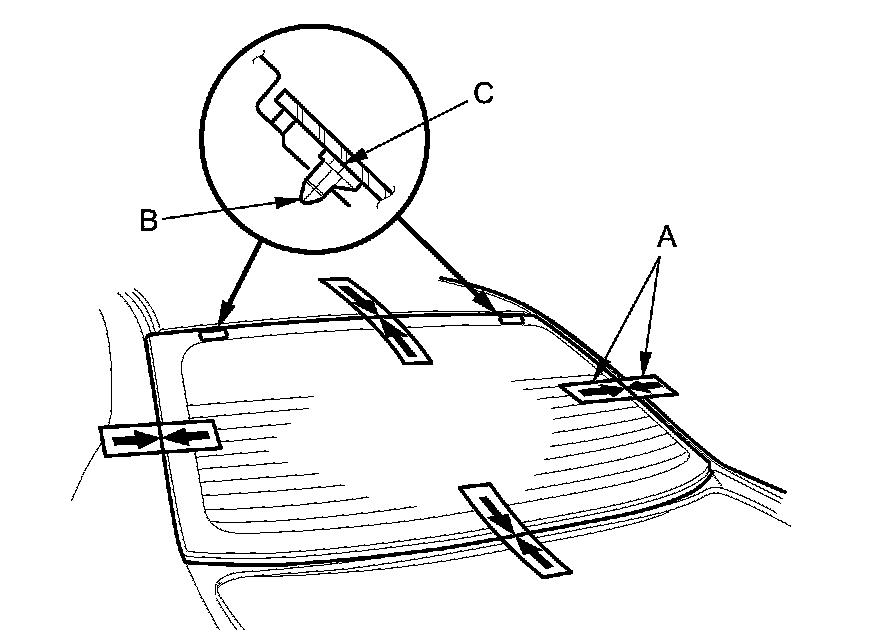 12. Apply glass primer to the edge of the rear window (A) where the lower rubber dam (B) will be attached as shown. Attach the lower rubber dam with adhesive tape (C) to the lower edge of the rear window: