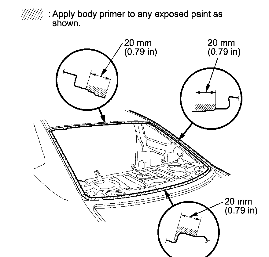 18. Carefully apply a light coat of body primer to any exposed paint or metal around the flange where the new adhesive will be applied. Let the body primer dry for at least 10 minutes: