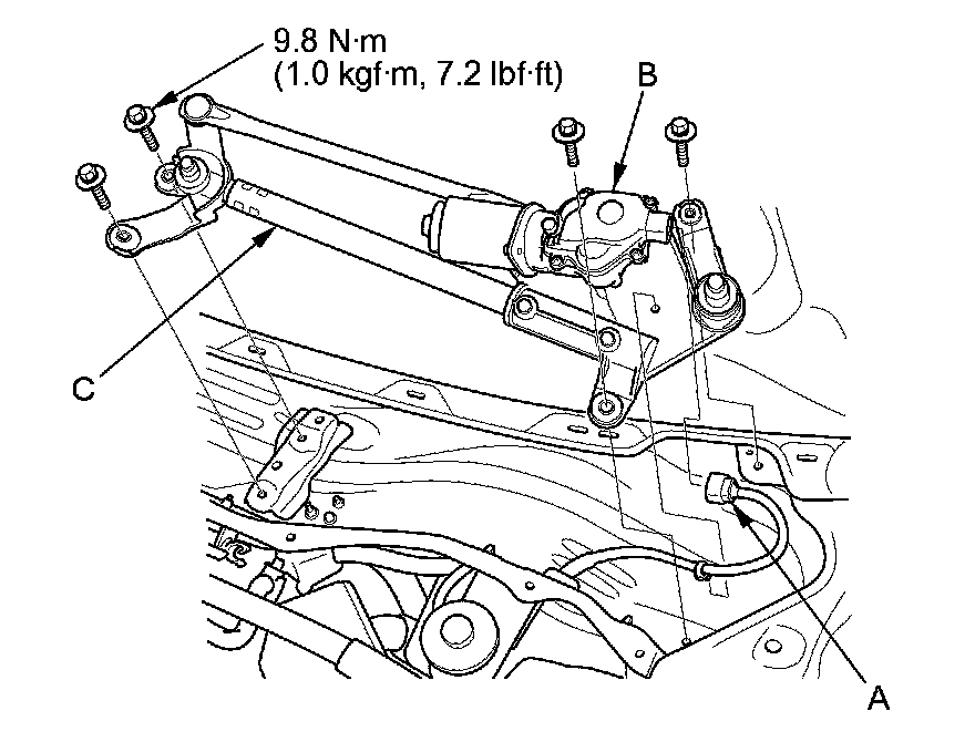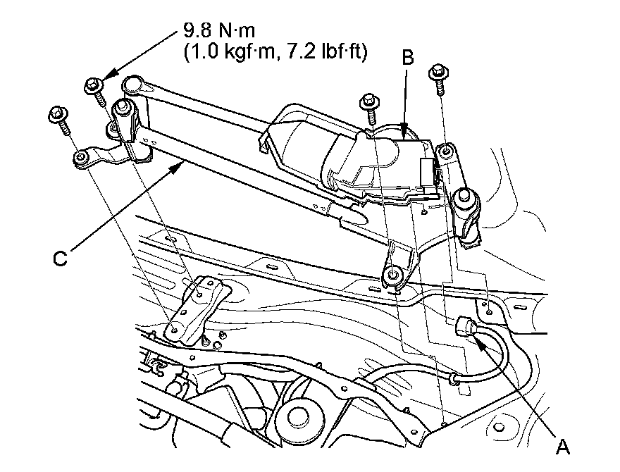 6. Remove the four bolts and wiper linkage assembly (C).