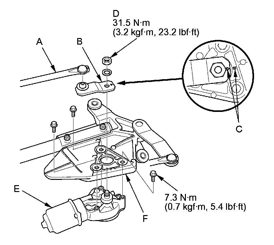 9. Remove the three bolts, and separate the windshield wiper motor from the linkage (F).