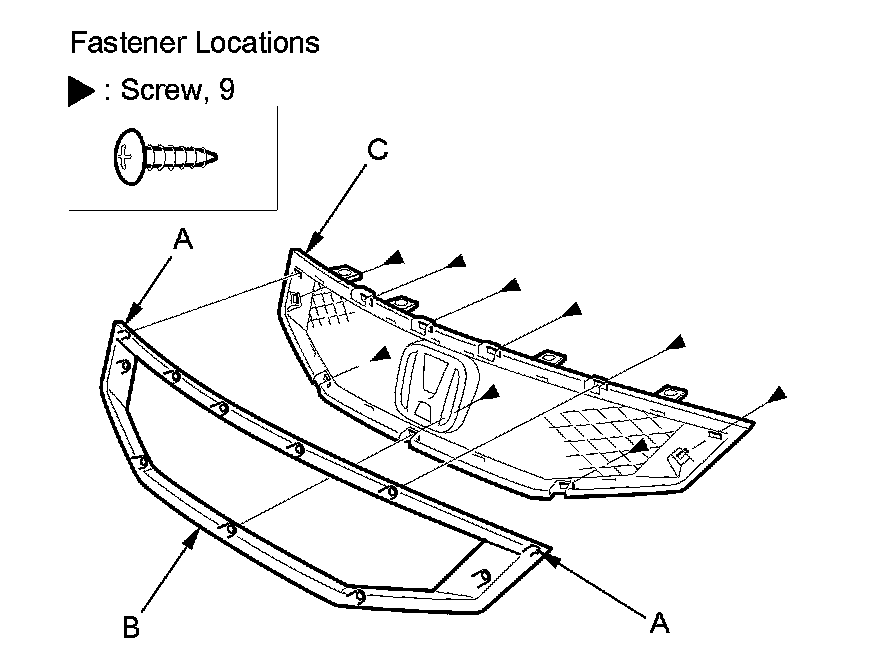 2. Remove the screws, and release the two hooks (A) with a flat-tip screwdriver, then remove the front grille molding (B) from the front grille base (C).