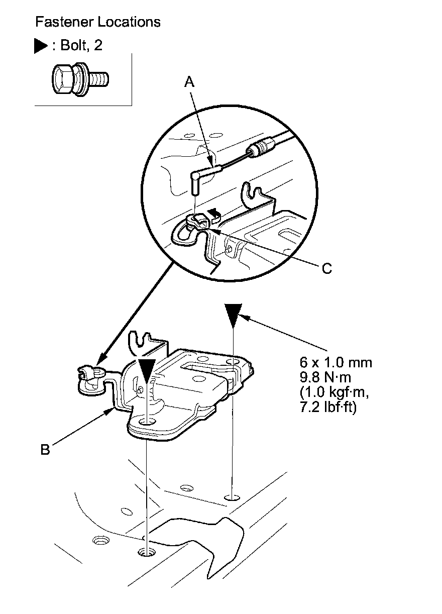 2. Disconnect the seat-back release cable (A) from the seat-back latch (B), and remove the bolts, then remove the latch. Take care not to damage the cable fastener (C).