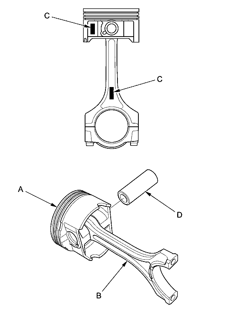 4. Assemble the piston (A) and the connecting rod (B) with the embossed marks (C) on the same side. Install the piston pin (D).