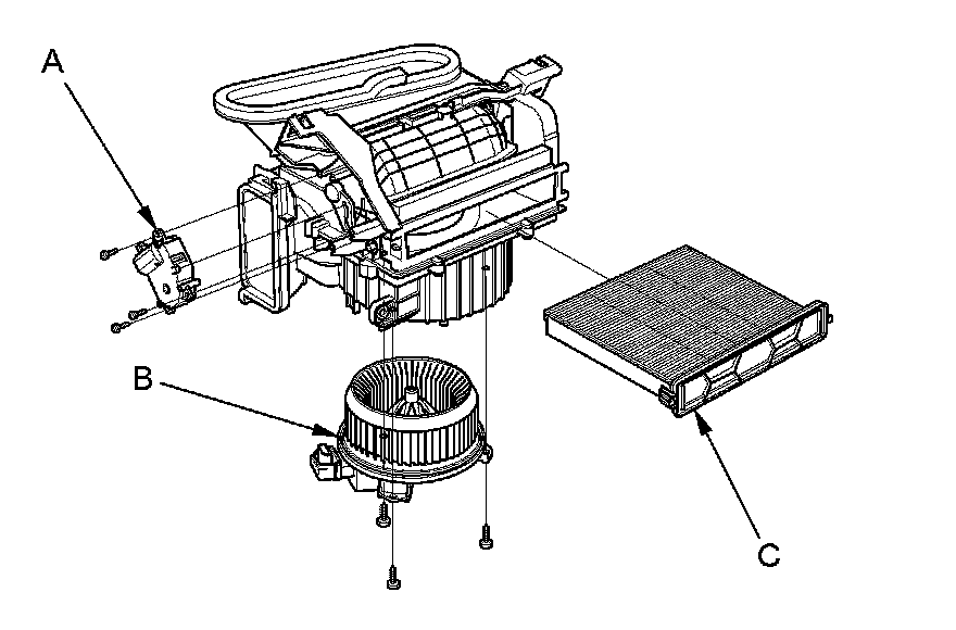 - The recirculation control motor (A), the blower motor (B), and the dust and pollen filter (C) can be replaced without removing the blower unit.